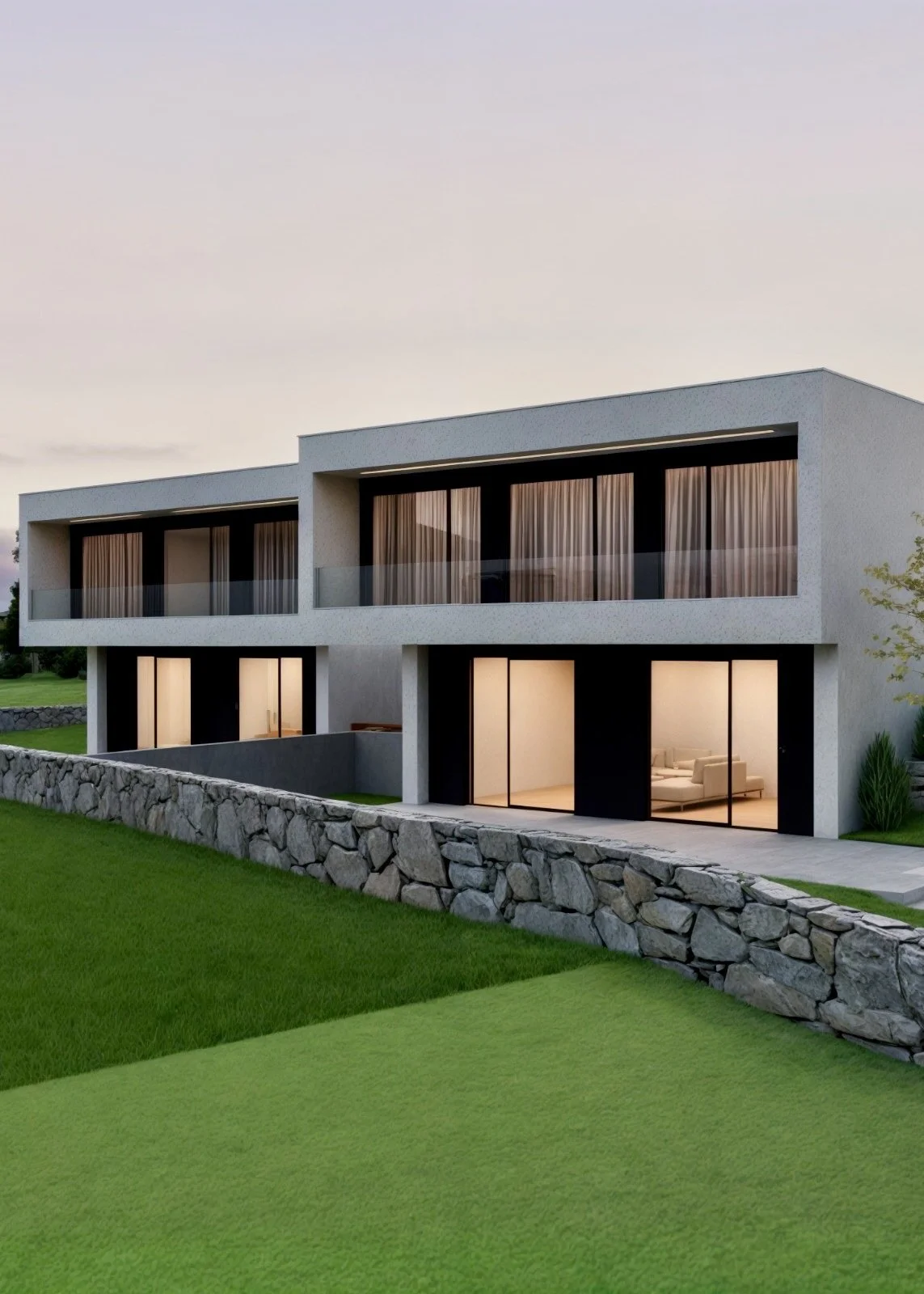 Com um design imponente e contemporâneo, este projeto destaca-se pela pureza das formas e pela integração perfeita entre arquitetura e paisagem. As amplas aberturas de vidro permitem que a luz natural invada os ambientes, criando uma sensação constante de amplitude e conforto.